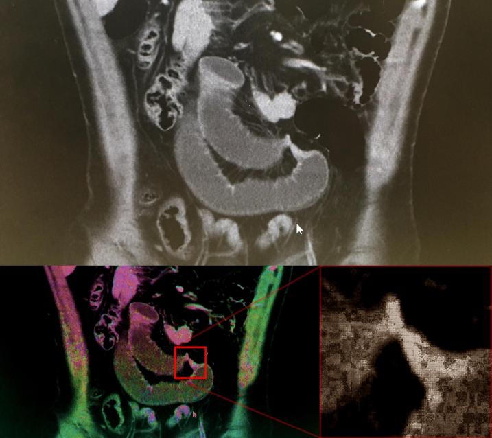 At my post-op checkup this week I was able to look at the CT scan (3D x-ray) that they took when I was rushed into hospital. The two large grey stubby tubes are the expanded sections of my small intestine, and the strangulated part connecting them is very easy to see:
