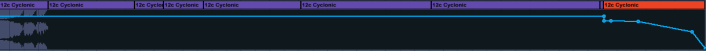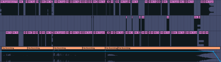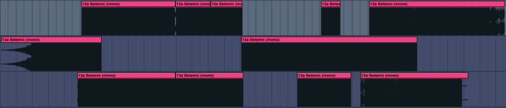 Armed with a collection of ensuing jams, I then cut up and edited/layered the results to achieve the results I had in mind. You can see from the screenshots below that the three layers in Seismic! are panned hard left, centre, and hard right respectively, and similarly for Scorching! along with an additional centred layer (though the central layers themselves are stereo so are actually comprised of hard-panned left and right channels).
